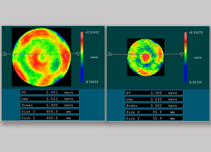 技术指标:1)面型精度:RMS≤0.02λ@632.8nm, PV≤ 0.15λ@632.8nm;2)元件等厚:误差≤3μm;3)同轴度:≤0.01;4)膜后反射:反射率≥98%